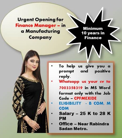 DESIGNATION : FINANCE MANAGER Placement charges is applicable EXPERIENCE : MINIMUM 10 YEARS salary - RS. 25 K TO 28 K P.M NOTICE MAXIMUM WITHIN 7 DAYS. JOB LOCATION AJC BOSE ROAD, NEAR EXIDE HOUSE. ELIGIBILITY - B COM WORKING HOURS: 10:00 A.M TO 7 P.M COMPANY PROFILE : Manufacturing Company (Multiple group) JOB PROFILE : Managing a Team of Accountants. Supervising the Accounts work in Multiple Units. Verification of Papers. Facilitating smooth operation and timely payments. Managing the purchase and sales Department TO HELP US GIVE YOU A PROMPT AND POSITIVE REPLY WHATSAPP US YOUR CV WITH JOB CODE CPFMEXIDE TO 7003358319 (PLEASE DO NOT CALL) Click the link to get job Offers from usECOMM CORPORATE RECRUITMENT SOLUTIONS